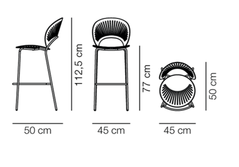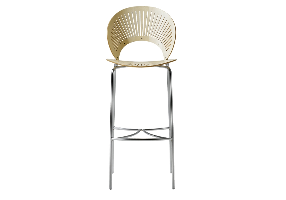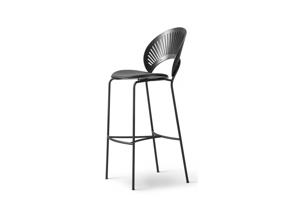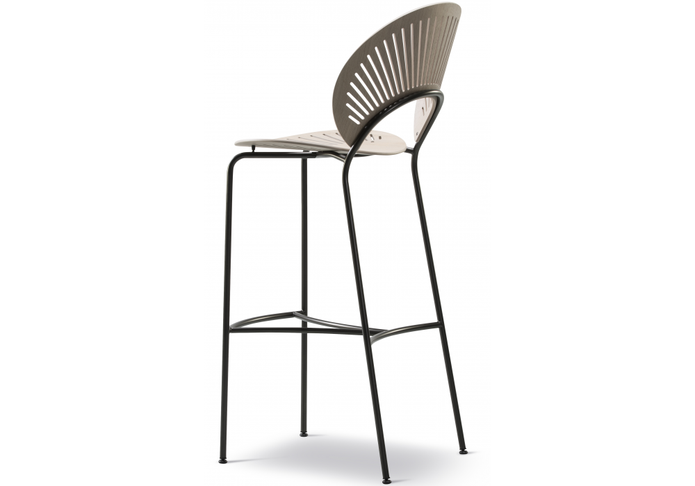 Trinidad von Nanna Ditzel für Fredericia entworfen, ist ein Barhocker mit Stahlrohrstruktur und Rückenlehne aus geformtem Sperrholz mit CNC-gefrästen Ausschnitten. Sitz und Rückenlehne mit Nieten befestigt.