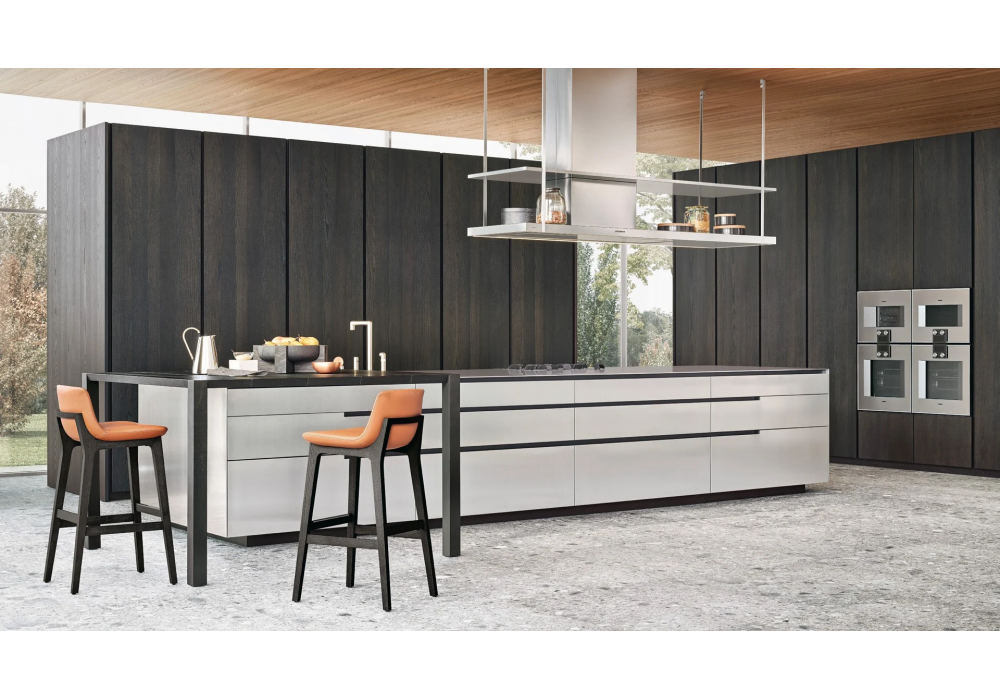 Ventura, entworfen von Jean-Marie Massaud für Poliform, ist ein Hocker mit Sockel aus massivem Holz. Bezug mit Stoff oder Leder.