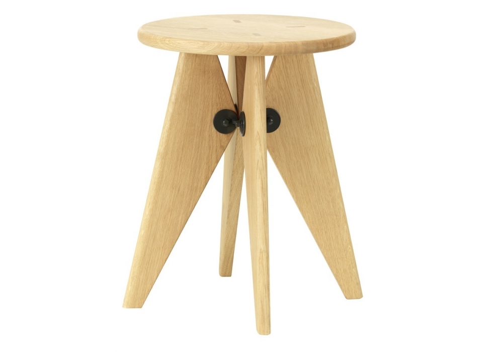 Tabouret Bois von Jean Prouvé für Vitra entworfen, ist ein Hocker aus Massivholz Eiche natur mit Öl-Finish, dunkel gebeizter Eiche mit natürlicher Schutzlackierung oder amerikanischem Nussbaum mit Öl-Finish. Verbindung aus pulverbeschichtetem Blech (glatt) in Tiefschwarz.