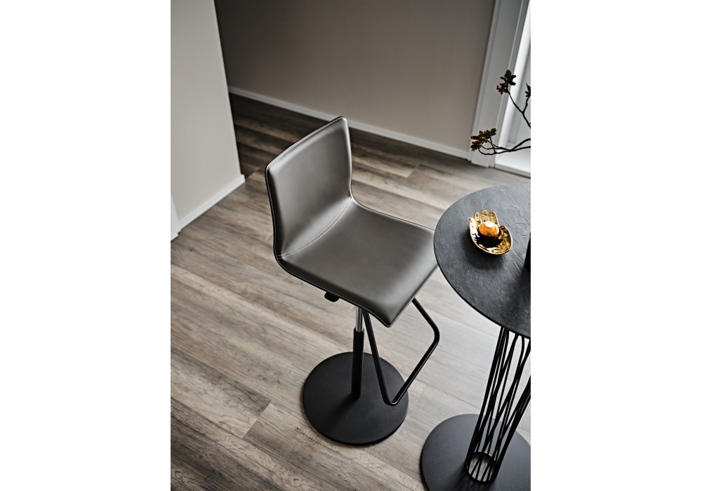 Toto von Paolo Cattelan für Cattelan Italia entworfen, ist ein drehbarer Hocker mit verstellbarer Höhe. Bezug aus Kernleder. Runder oder quadratischer Sockel aus Edelstahl satiniert und Säule, Fußraste und Gasdruckfeder aus verchromtem Stahl, oder Basis, Säule, Fußraste in Stahl lackiert schwarz gaufriert und Gasdruckfeder aus verchromtem Stahl.