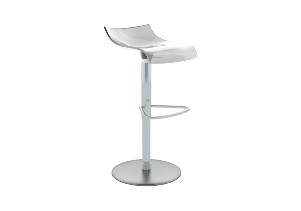Pam von Claudio Dondoli & Marco Pocci für Ligne Roset entworfen, ist ein Barhocker, verstellbar über Gasdruckfeder, mit Sitzfläche aus furniertem Buchen-Mehrschichtholz, transluzentem PMMA, mattschwarzem PMMA oder Buchen-Mehrschichtholz bezogen mit Syndermeleder. Gestell aus matt verchromtem Metall; Fußstütze in glänzendem Chrom.
