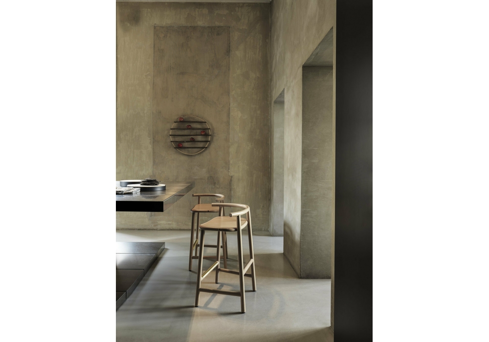 Single Curve von Nendo für Gebrüder Thonet Vienna entworfen, ist ein Hocker aus gebogener Buche, erhältlich in verschiedenen Ausführungen. Sitz aus Sperrholz oder Wiener Stroh. Fußrastenstange mit Messing überzogen.