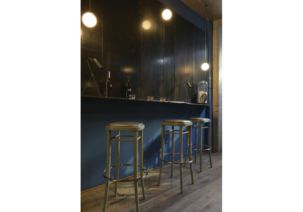 Vienna 144 von Gebrüder Thonet Vienna entworfen, ist ein Barhocker aus gebogener Buche, erhältlich in verschiedenen Ausführungen. Gepolsterter Sitz mit Stoff- oder Lederbezug. Fußstütze bestehend aus einem Ringelement aus verchromtem Metall.
