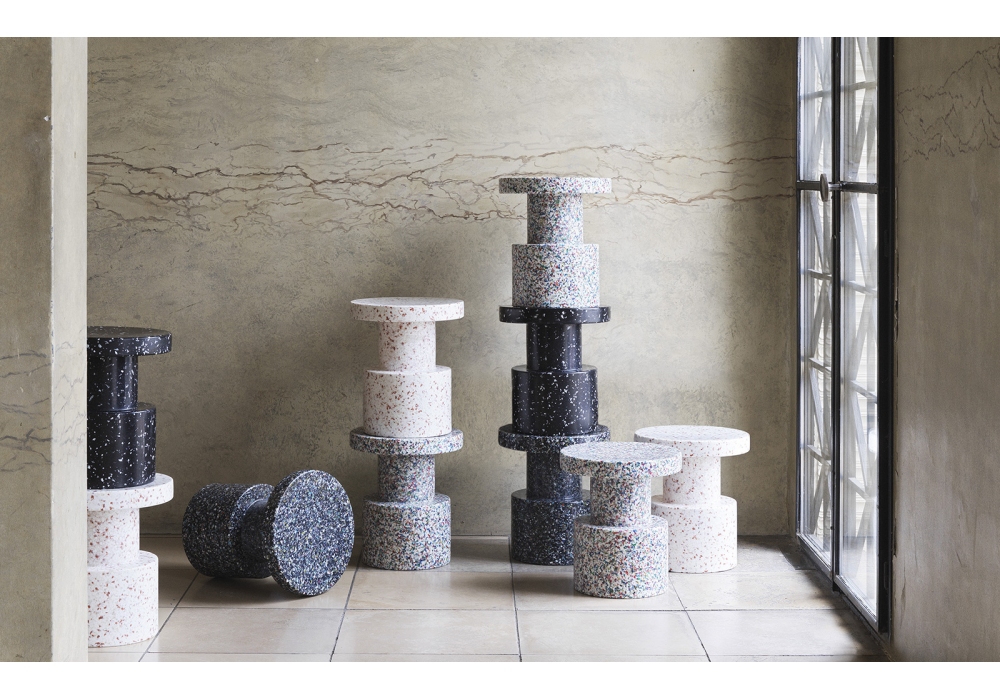 Bit, entworfen von Simon Legald für Normann Copenhagen, ist ein vollständig aus recyceltem Kunststoffmaterial strukturierter Hocker mit zylindrischer Form in vier verschiedenen Ausführungen; weiß, schwarz, multi weiß oder multi schwarz.