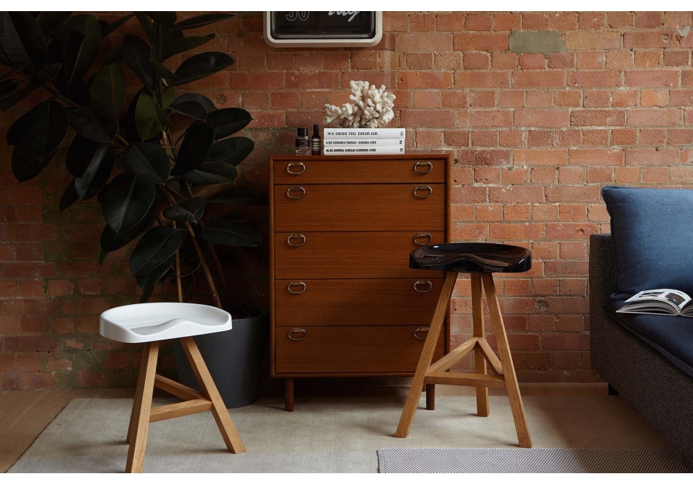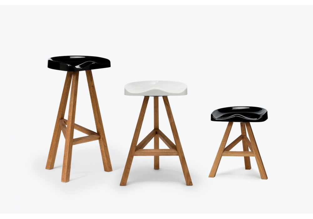 Heidi von Sebastian Wrong für Established & Sons entworfen, ist ein Hocker mit Struktur aus Eiche und ergonomischem Sitz aus Polyesterharz. Erhältlich in Schwarz und Weiß. Erhältlich in verschiedenen Größen.
