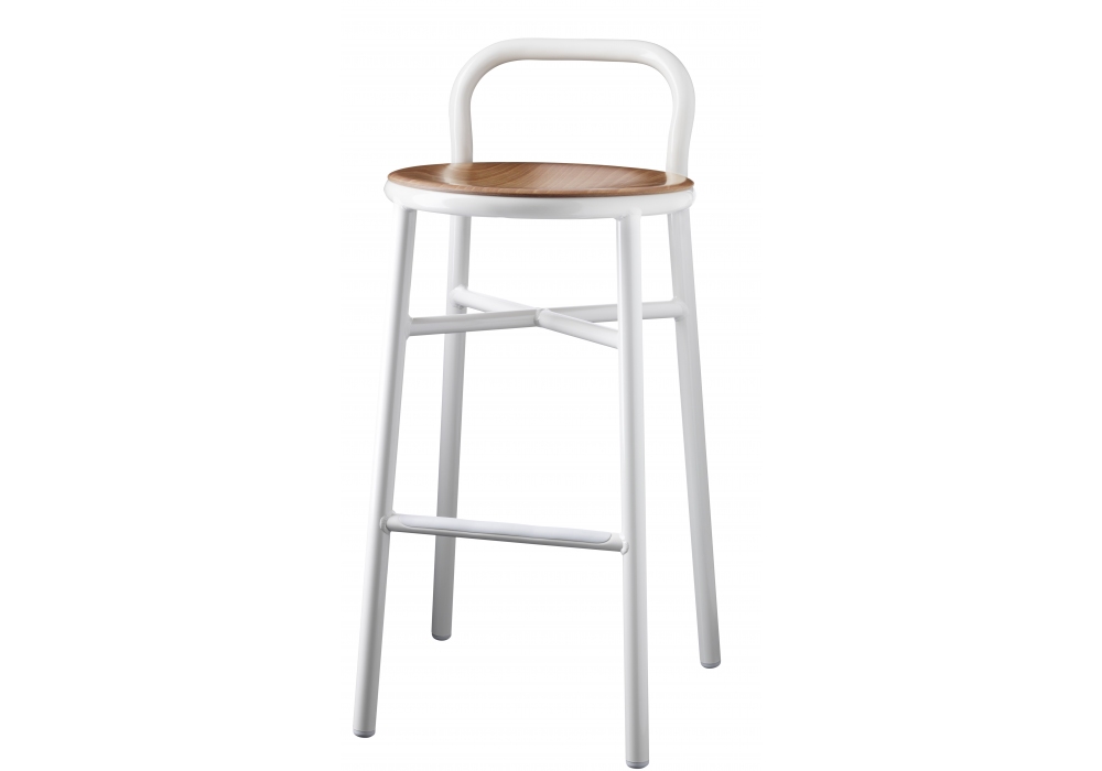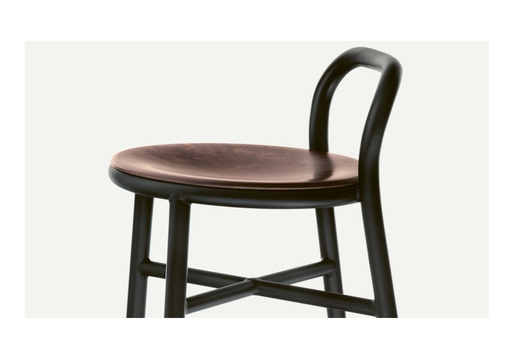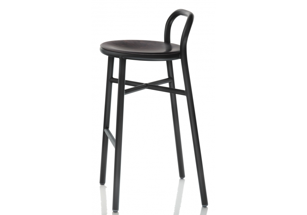 Pipe Beech von Jasper Morrison für Magis entworfen, ist ein Hocker mit einem Gestell aus polyesterlackiertem Aluminiumrohr in verschiedenen Ausführungen und einer Sitzfläche aus Buchenfurnier.