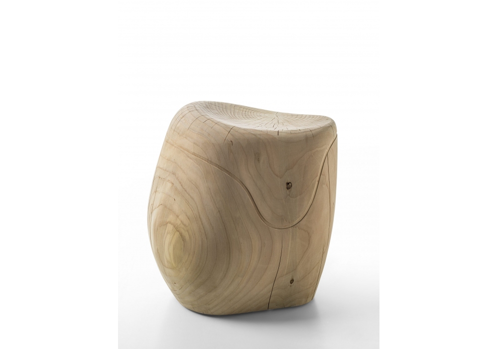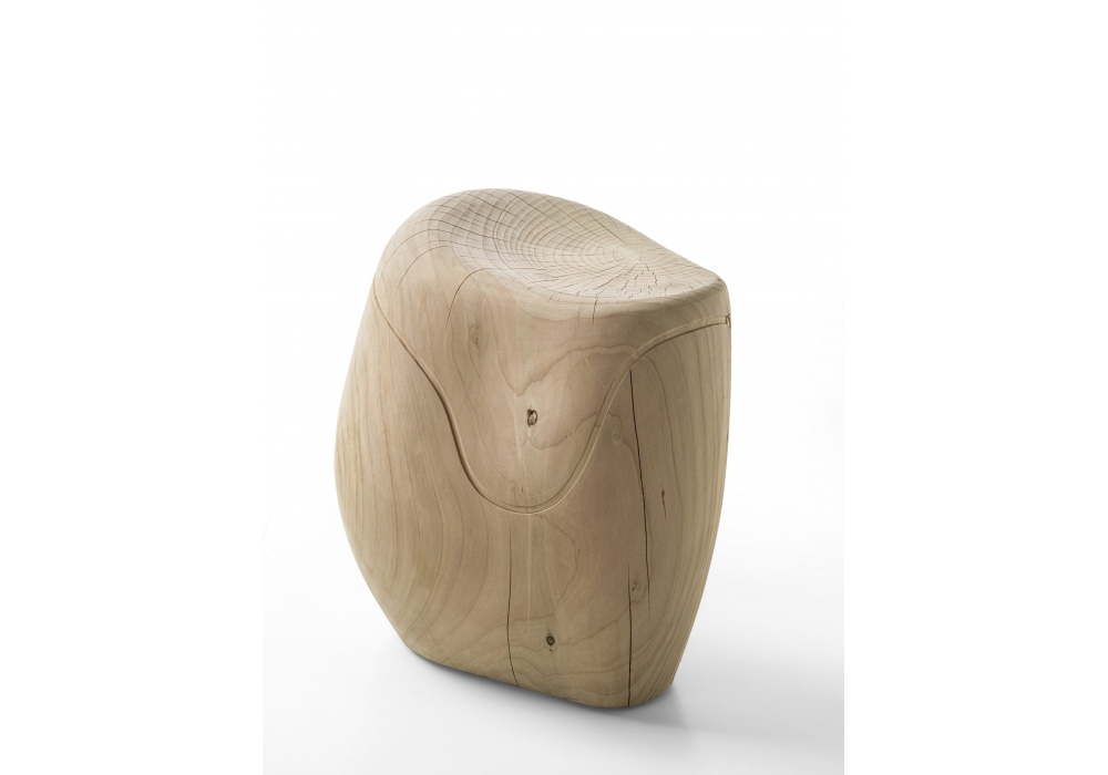 Kura von Rey Hamada für Riva 1920 entworfen, ist ein Hocker aus massivem duftendem Zedernholz, der aus einem einzigen Block gearbeitet ist, dessen Form eine Nachstellung eines Pferdesattels ist, daher die Bedeutung des Namens auf Japanisch.