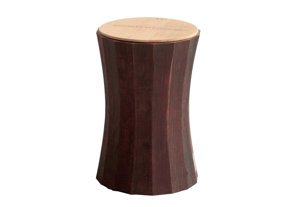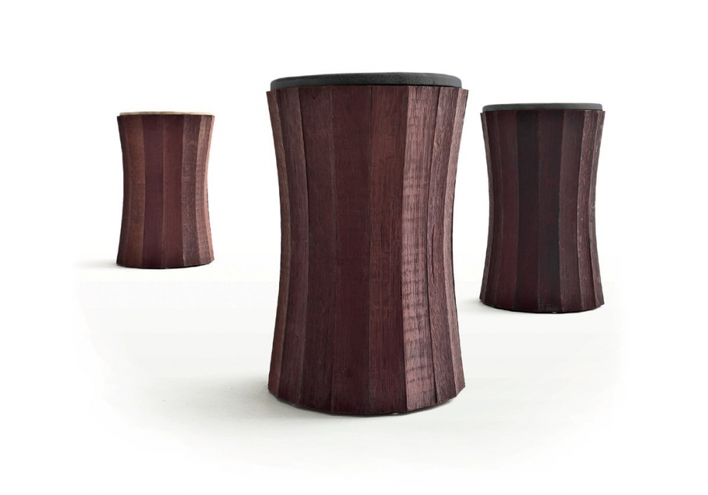 Inverso von Karim Rashid für Riva 1920 entworfen, ist ein Hocker mit Holzsitz, dessen Form durch die radiale Kombination der aus Barriques stammenden Lamellen und durch die typische burgunderrote Farbe gekennzeichnet ist.