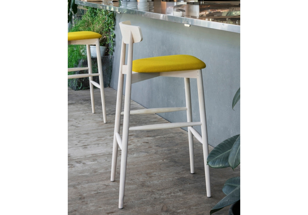 Claretta von Florian Schmid für Miniforms entworfen, ist ein Hocker aus Esche, Sitz mit Stoff- oder Kunstleder bezogen. Erhältlich in verschiedenen Ausführungen und Größen.