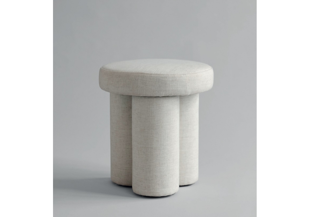 Big Foot von Kristian Sofus Hansen & Tommy Hyldahl für 101 Copenhagen entworfen, ist ein Hocker, der sich durch drei runde Beine und einen weichen Sitz auszeichnet. Bezug aus kreidefarbener Baumwolle und Leinen oder aus weißem Schaffell.