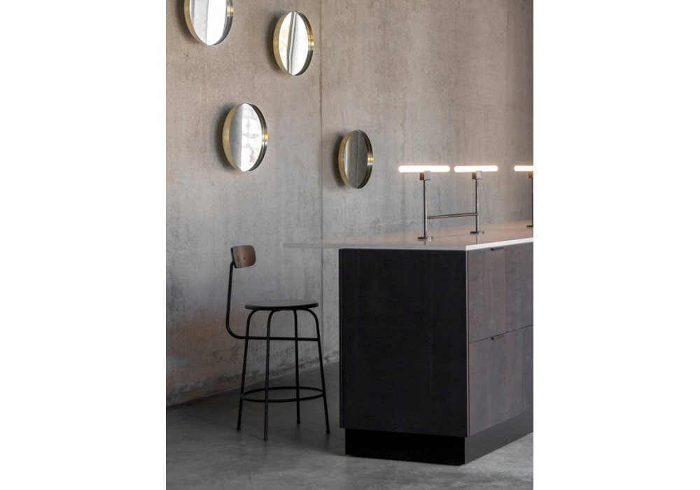 Afteroom Counter von Afteroom Studio für Audo Copenhagen entworfen, ist ein Hocker aus schwarz pulverbeschichtetem Stahl, gepolsterter Sitz mit Stoff- oder Lederbezug. Erhältlich in verschiedenen Ausführungen und Größen.