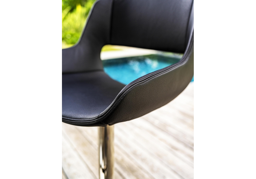 Amaranta von Cappelletti & Pozzoli für Enrico Pellizzoni entworfen, ist ein Hocker mit Schale aus starrem Polyurethan, drehbarer Basis aus verchromtem Stahl, höhenverstellbar. Polster in verschiedenen Materialien und Farben erhältlich.