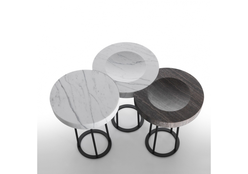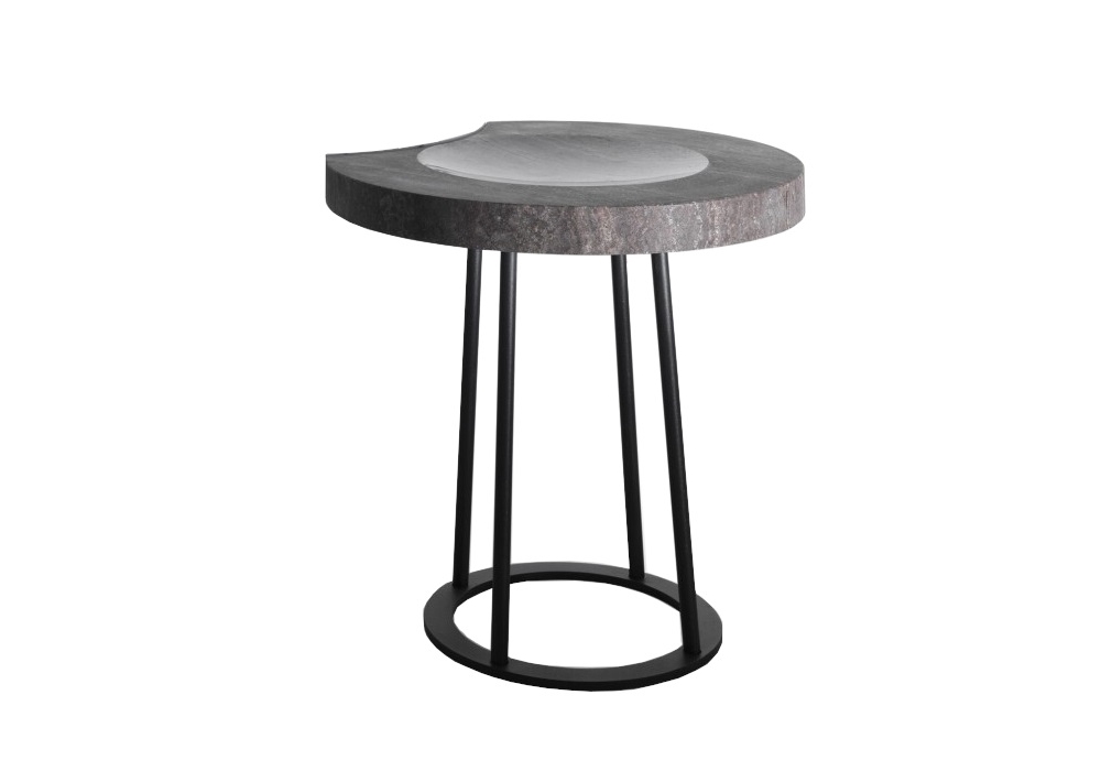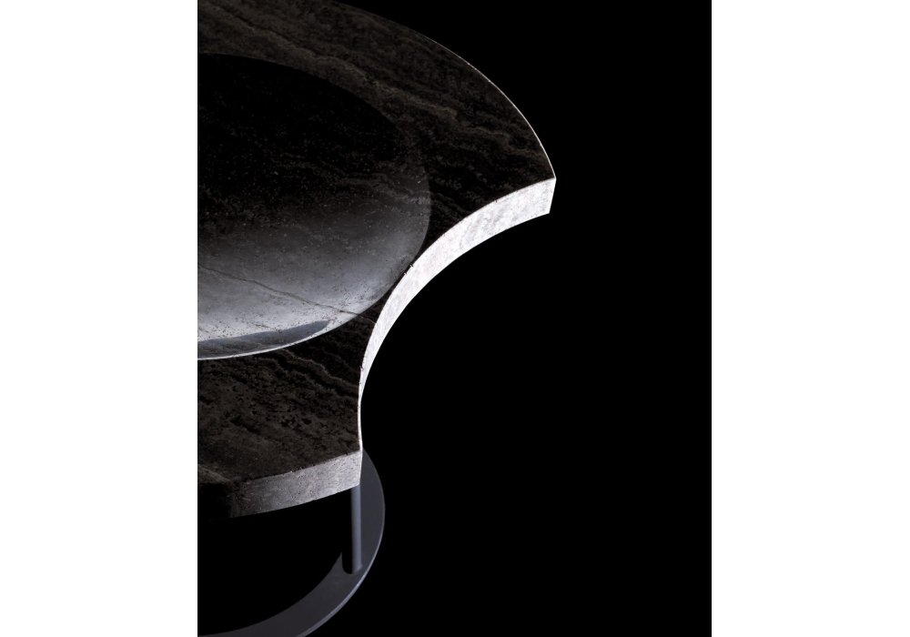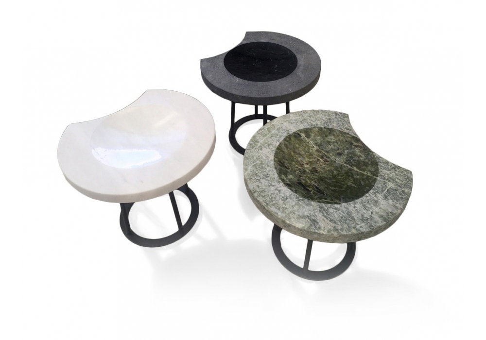 Moon von Enzo Berti für Kreoo entworfen, ist ein Hocker mit mattschwarzer Metallstruktur und runder Platte aus Marmor oder Holzessenz.