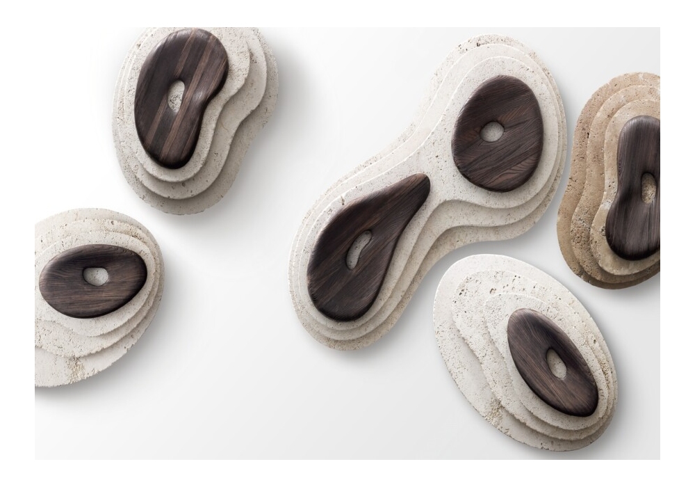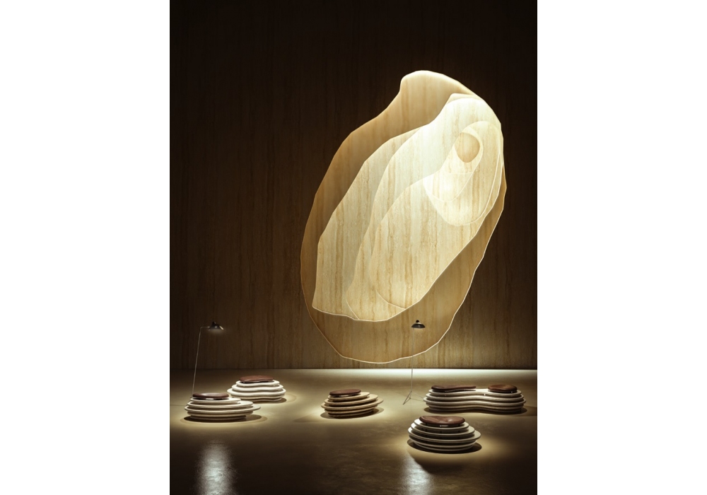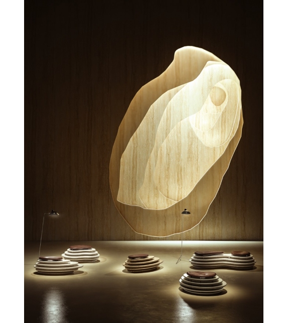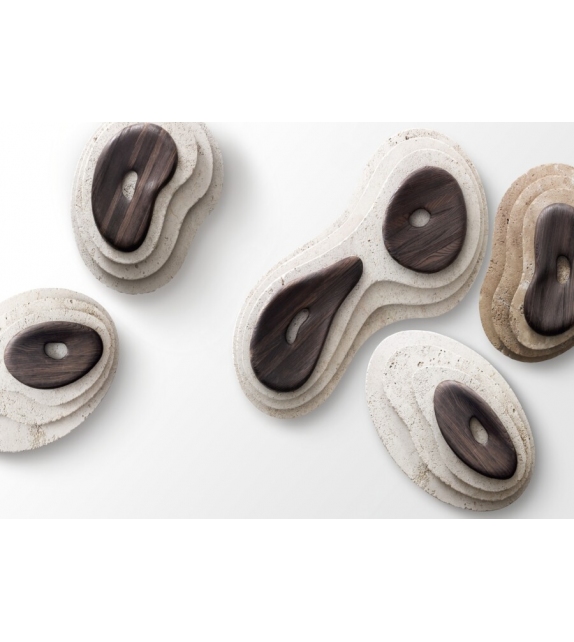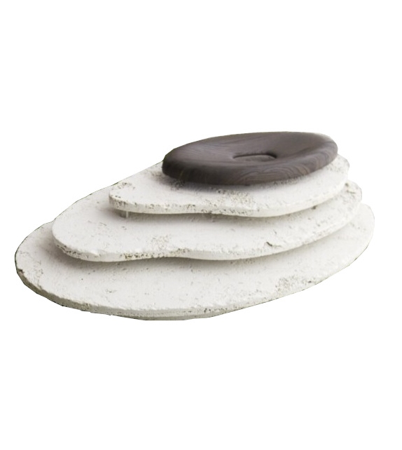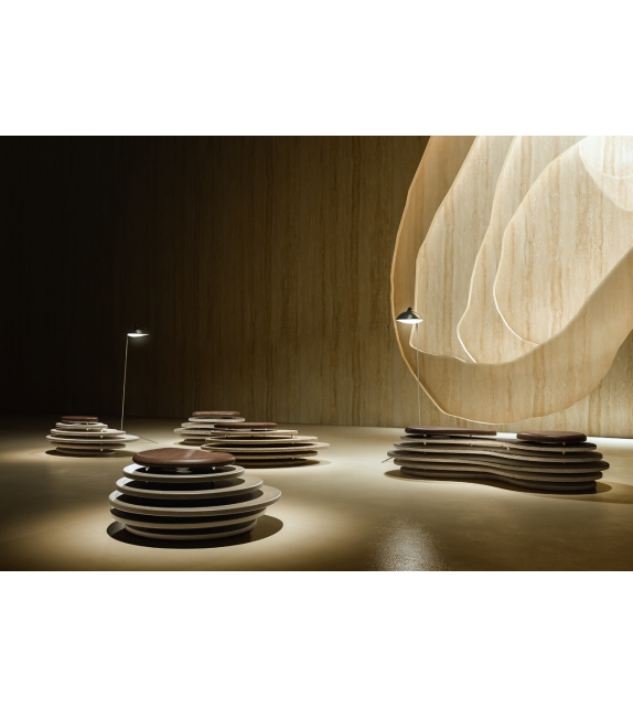 Oasi von Enzo Berti für Kreoo entworfen, ist ein Hocker aus Marmor, der durch Übereinanderlegen mehrerer horizontaler Natursteinschichten hergestellt wird, die durch vertikal angeordnete Metallrohre miteinander verbunden sind. Sitz in gealterter Lärche. Verfügbar in mehreren Modellen.