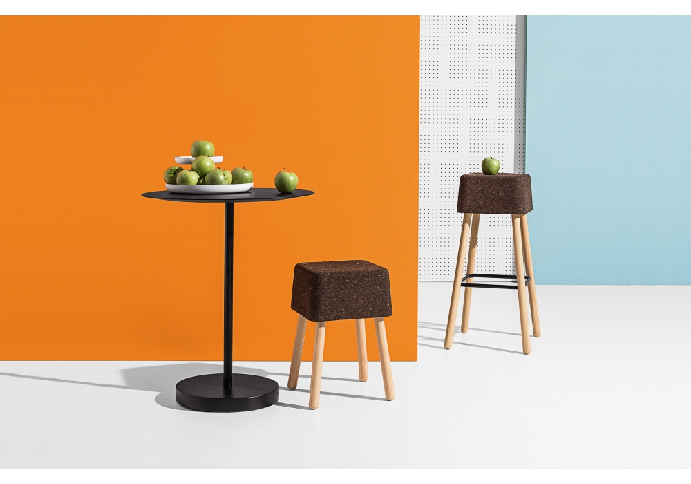 Bombetta Cube von Discipline Lab entworfen, ist ein Hocker mit Sitz aus natürlichem oder schwarzem Kork, Beinen aus natürlicher oder schwarz gebeizter Esche. In drei verschiedenen Höhen erhältlich, verfügt die höchste Version zusätzlich über eine praktische Fußstütze aus geprägtem schwarzem Metall.