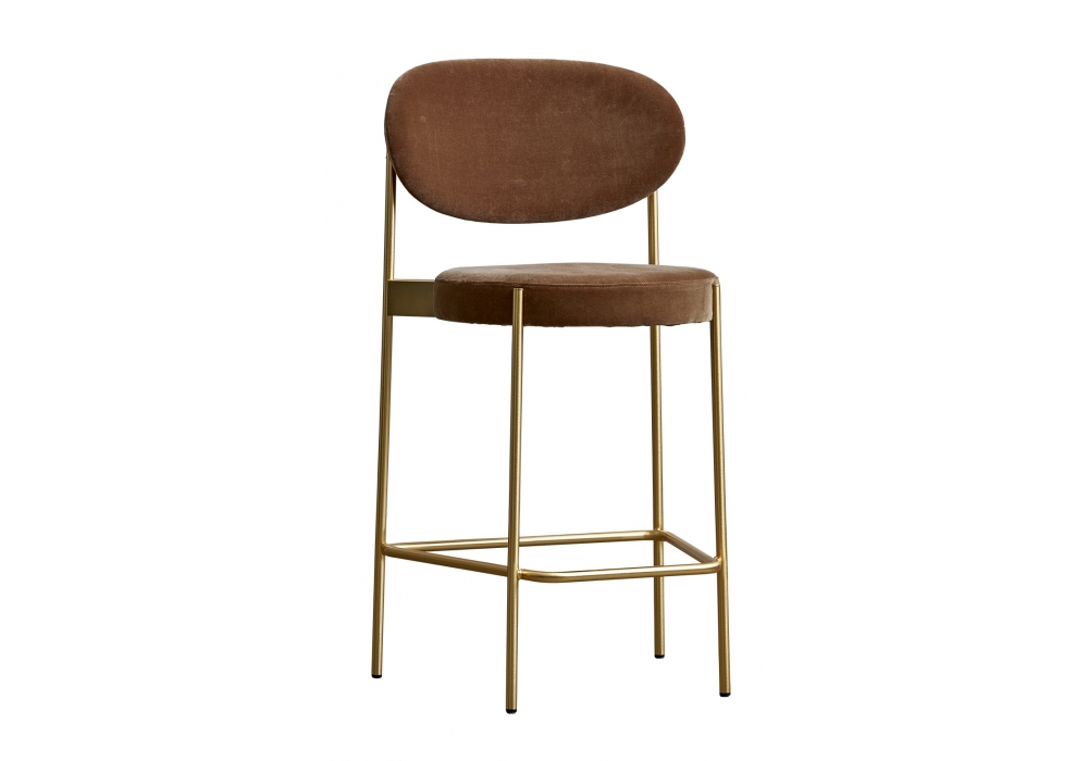 Series 430 von Verner Panton für Verpan entworfen, ist ein Set von 2 Bar Hocker mit Metallstruktur in Messingausführung mit Filzfüßen. Rückenlehne und Sitz komplett gepolstert und mit verschiedenen Stoffen oder Ledern bezogen. Verfügbar in zwei Dimensionen.