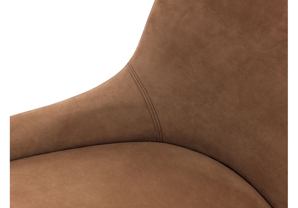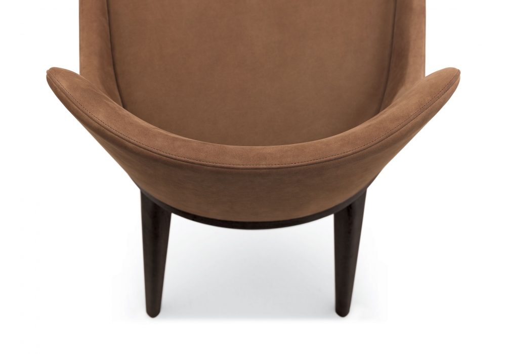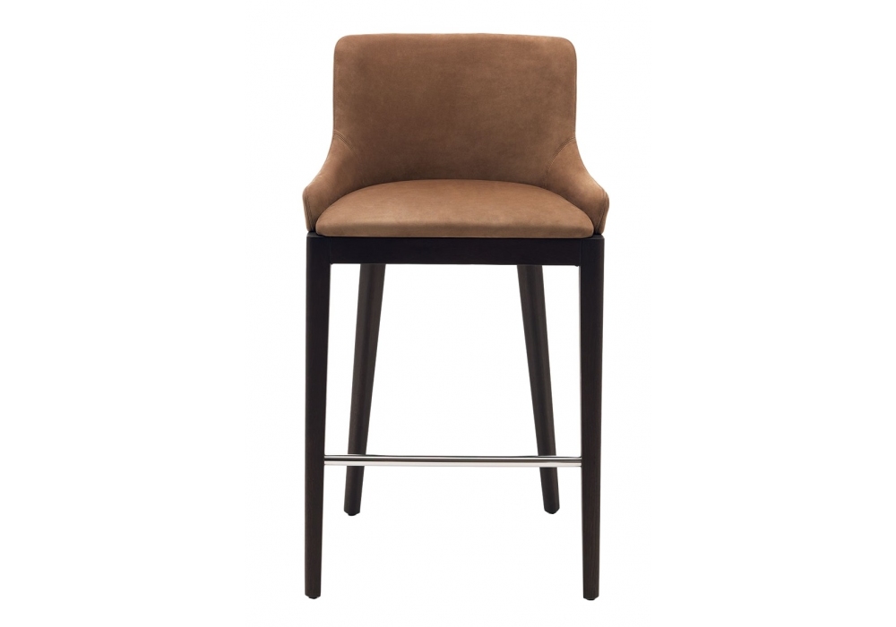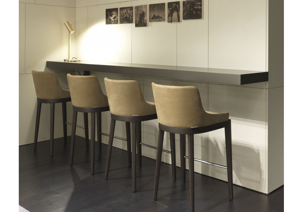 Cleò von MisuraEmme entworfen, ist ein Hocker mit einem handgefertigten Untergestell aus gebeizter massiver Eiche und einer geschwungenen Sitzfläche und Rückenlehne, die mit Stoff oder Leder bezogen sind.