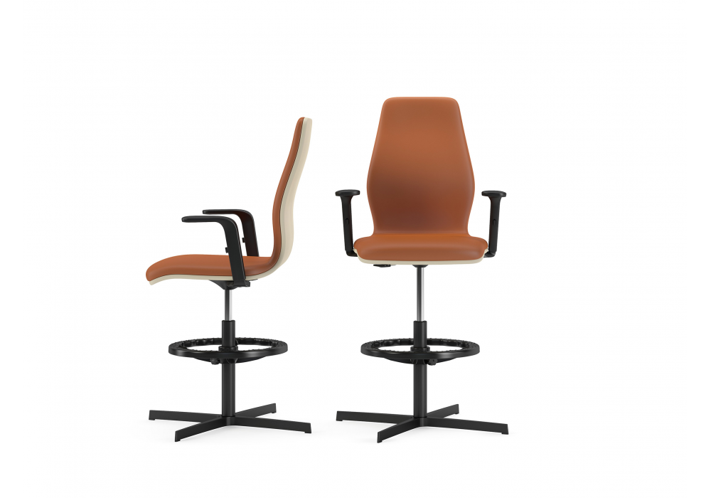 Nami von R&D Sitlosophy für Sitlosophy entworfen, ist ein Hocker mit einer Struktur, die sich durch eine einzelne Schale aus gebogenem Sperrholz, eine Polsterung aus flexiblem Polyurethanschaum und einen Bezug aus Leder, Kunstleder oder Stoff auszeichnet. Armlehnen aus Polypropylen, höhenverstellbar.