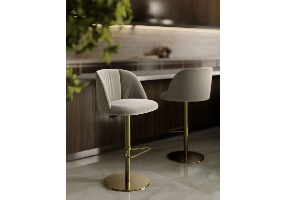 Agatha, von E-ggs für Bontempi entworfen, ist ein drehbarer und höhenverstellbarer Hocker mit verchromtem Gaslift, verchromter oder lackierter Stahlstruktur. Gepolsterter Sitz und Rückenlehne mit Stoff- oder Lederbezug. Erhältlich in verschiedenen Ausführungen.