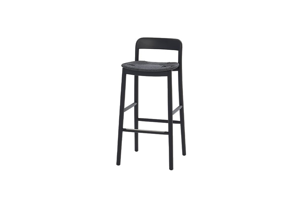 Villetta von Keiji Takeuchi für DePadova entworfen, ist ein Hocker mit einem Gestell aus massiver, schwarz anilingefärbter Esche, transparent lackiert. Sitzfläche aus gebogenem, schwarz gebeiztem Buchensperrholz, bespannt mit naturgrauer, handgeflochtener Papierkordel. Fußstütze aus Edelstahl.