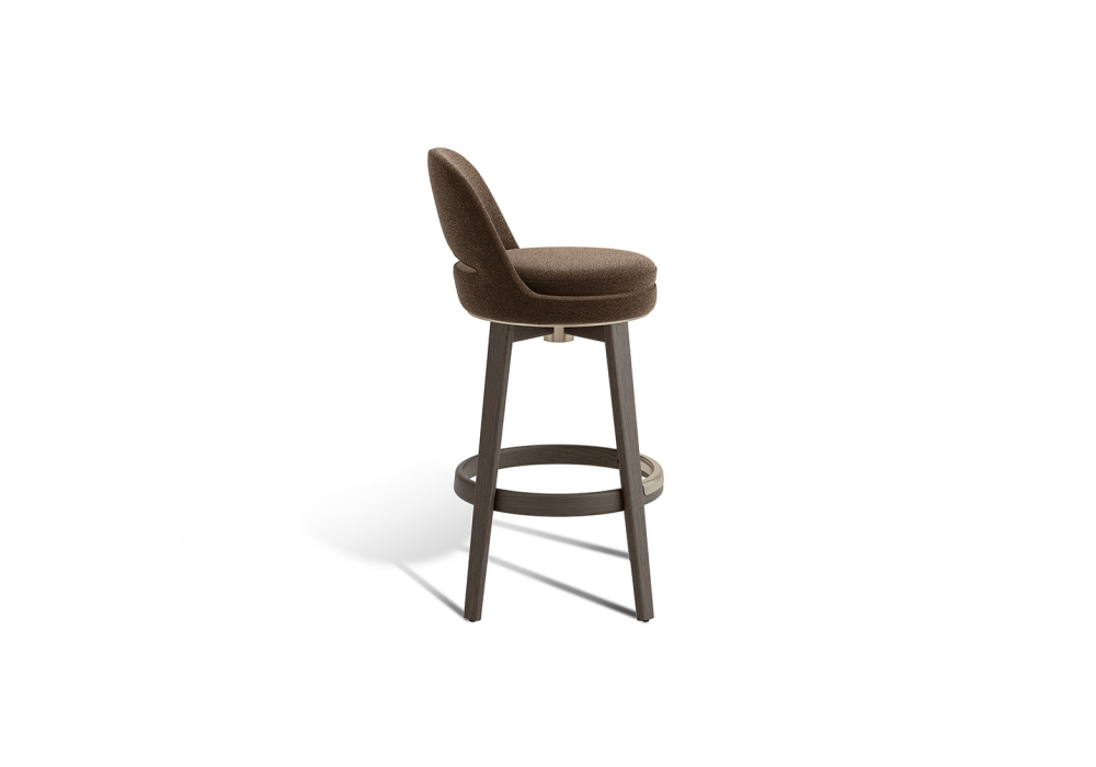 Mollis von Vincent Van Duysen für Molteni&C entworfen, ist ein Hocker mit einem Gestell aus gebeiztem Massivholz und einer Unterkonstruktion aus lackiertem Stahl. Er verfügt über einen um 360° drehbaren Sitz mit Rückstellfunktion. Die Fußstütze ist aus lackiertem Aluminium gefertigt. Sitzfläche und Rückenlehne bestehen aus einem Polimex-Rahmen und sind mit Polyurethanschaum unterschiedlicher Dichte gepolstert. Das Kissen ist aus konturiertem Polyurethan gefertigt und mit Polyesterfasern bezogen.