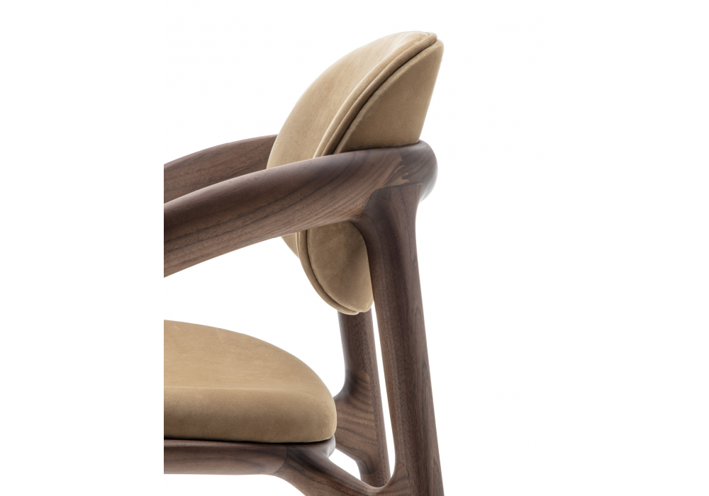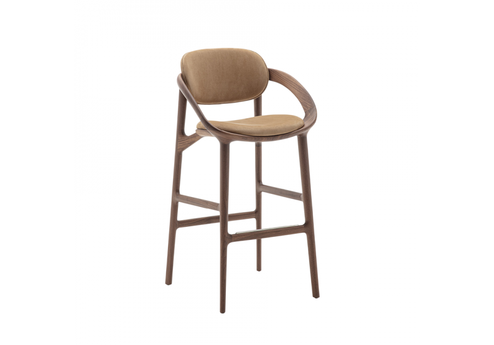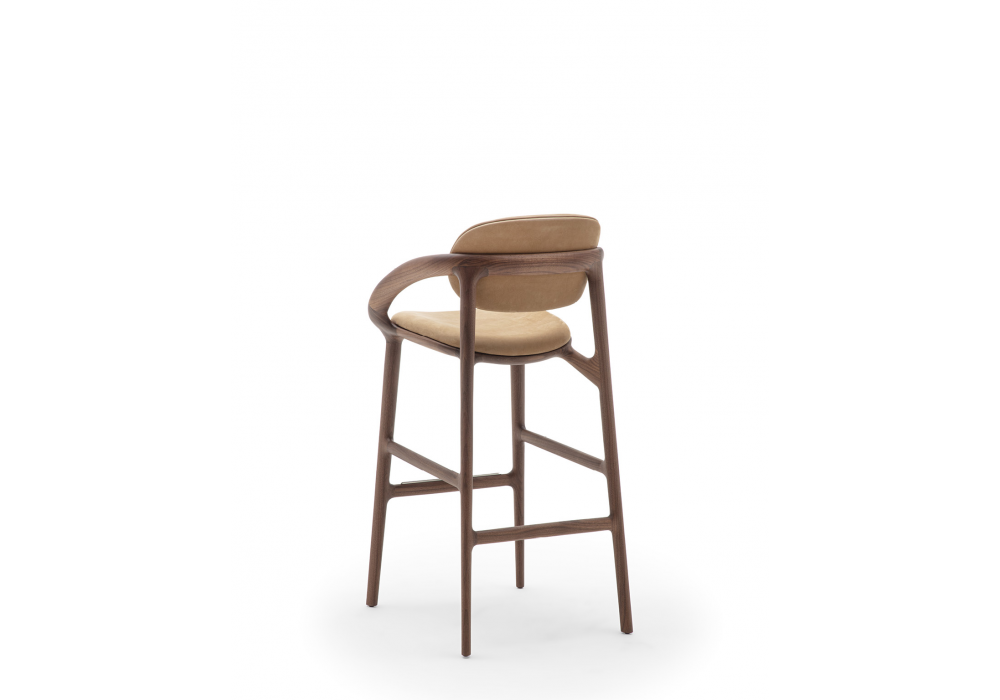 Molly von Meneghello Paolelli für Porada entworfen, ist ein Hocker mit einem Gestell aus massivem Canaletta-Nussbaum oder Eiche und einem Sitz- und Rückenkissen, das mit Stoff oder Leder bezogen ist. Die vordere Fußstütze ist mit einem Detail aus Edelstahl versehen.