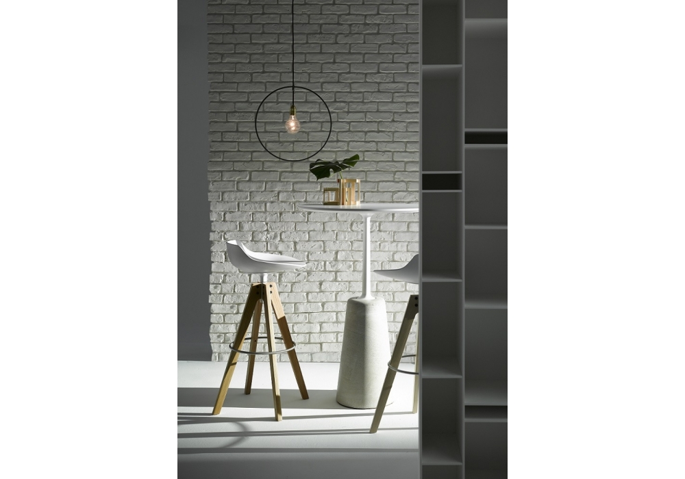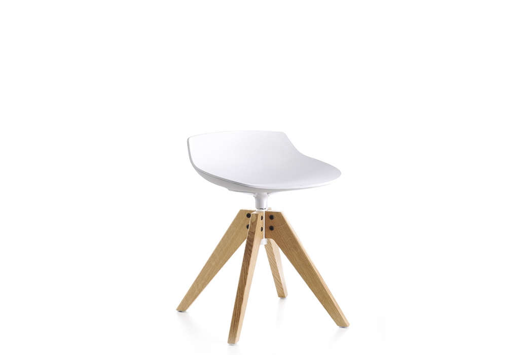 Flow Stool von Jean Marie Massaud für MDF Italia entworfen, ist ein Hocker mit Polyurethanschale, durch Formen erhalten, in matt weiß und schwarz mit geprägtem Finish. Die Basis besteht aus 4 Beinen aus Eiche VN mit einer Struktur aus transparent lackierter, natürlicher massiver Eiche in verschiedenen Ausführungen. Die Einhängestütze ist passend zur Schale aus mattweiß oder graphitgrau lackiertem Aluminium. Die Fußstütze ist aus gebürstetem Edelstahl. Der Hocker lässt sich um 360° drehen.