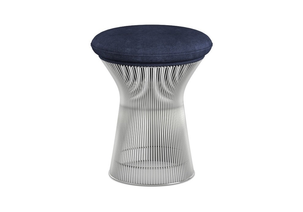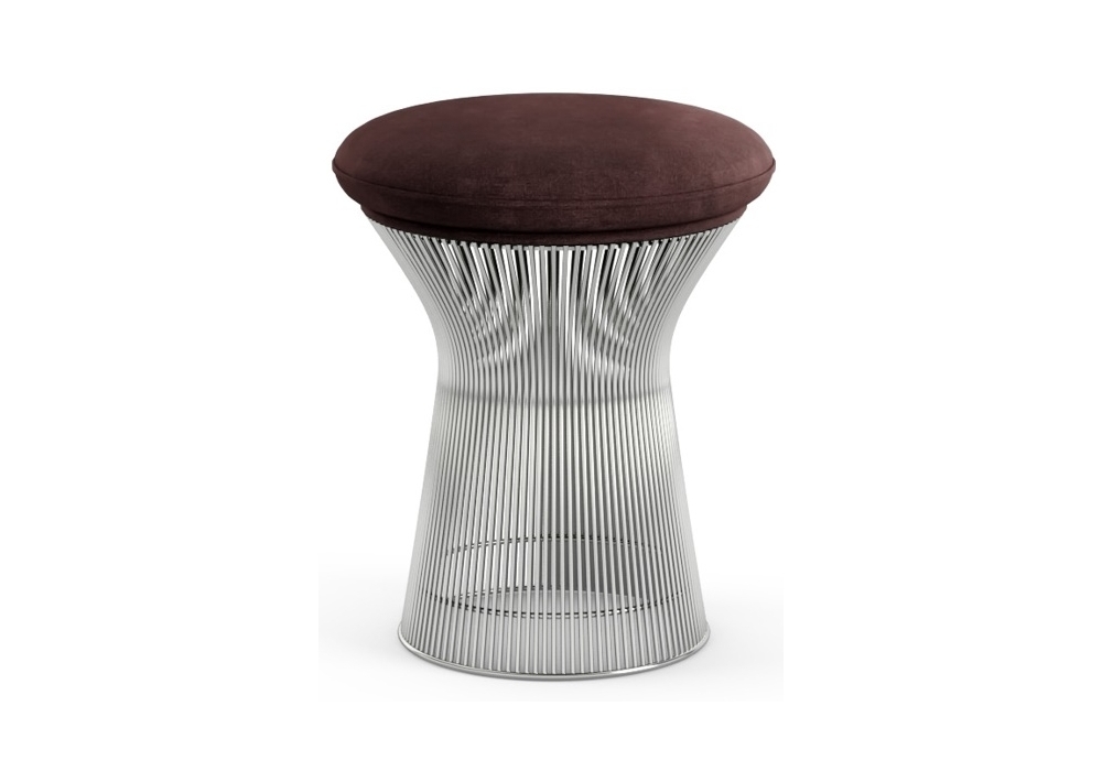 Platner von Warren Platner für Knoll entworfen, ist ein Hocker mit einer Struktur aus vertikal und horizontal geformten Metallstäben, die mit Nickelbeschichtung und transparentem Schutzlack behandelt wurden, bronzefarben lackiert oder in 18 Karat Gold ausgeführt. Basis mit transparentem extrudiertem Kunststoff eingefasst, um den Boden zu schützen. Bezug aus Stoff oder Leder.