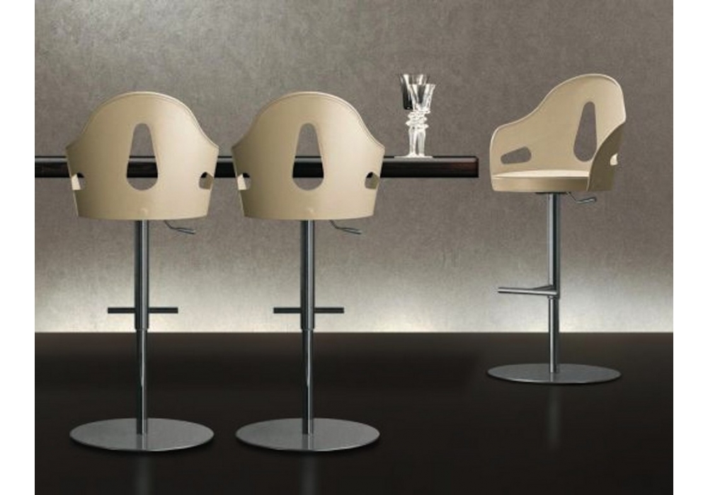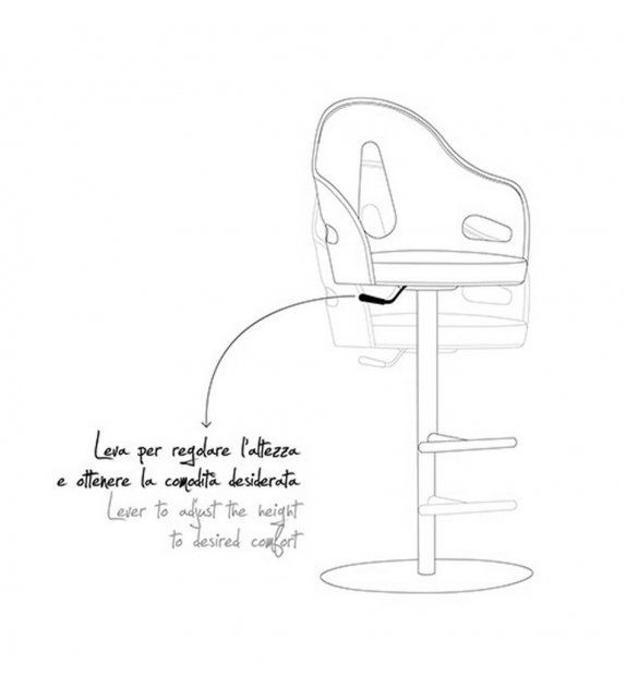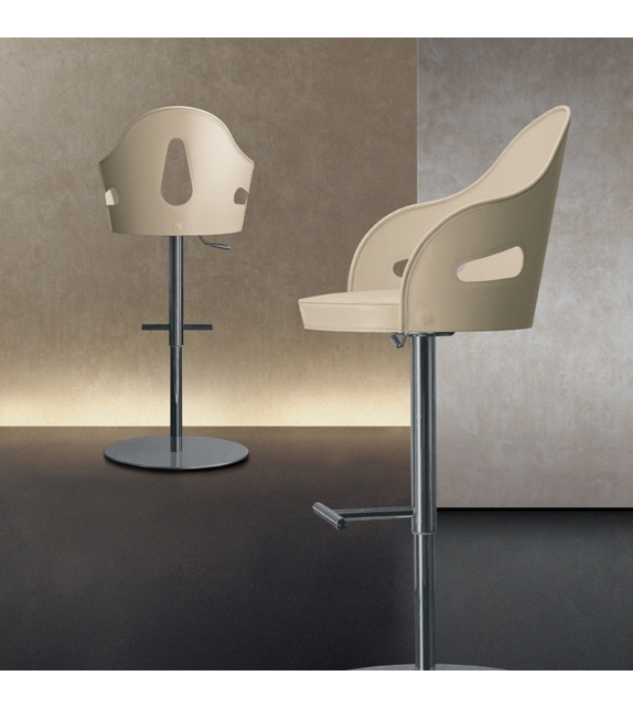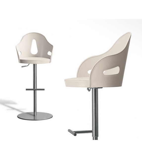 Dora is a swivel bar stool designed by Massimo Scolari for Giorgetti.Bar stool with adjustable height thanks to a spring mechanism, with base structure in satinfinished steel. The structure of the seat is in multilayer and the padding is in multi-density expanded polyurethane. The structure of the backrest is in curved aluminium. The covering is in saddle leather, which is available in different colours while the backrest can be matched to different shades of piping.