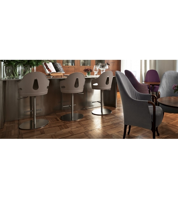 Dora is a swivel bar stool designed by Massimo Scolari for Giorgetti.Bar stool with adjustable height thanks to a spring mechanism, with base structure in satinfinished steel. The structure of the seat is in multilayer and the padding is in multi-density expanded polyurethane. The structure of the backrest is in curved aluminium.
