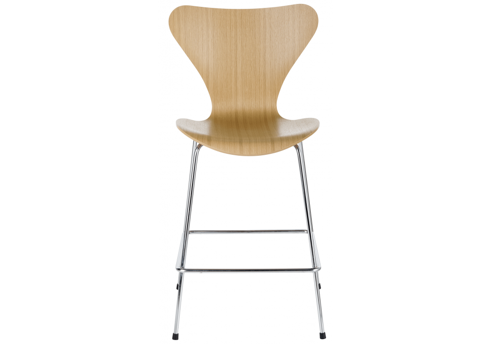 Serie 7 Counter Stool von Arne Jacobsen für Fritz Hansen entworfen, ist ein Hocker mit Schale aus furniertem Holz oder lackierter oder gefärbter Esche und Beinen aus verchromtem oder pulverbeschichtetem Stahlrohr. Verfügbar in mehreren Ausführungen.