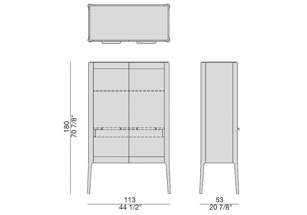 Atlante von Carlo Ballabio für Porada entworfen, ist ein ausgestatteter Barschrank aus Canaletta-Walnuss oder Esche mit zwei Rauchglastüren und einer Holzplatte. Ausgestattet mit drei Innenfächern mit Getränkehaltern und einer Schublade mit langsamem Schließen. Internes Regal aus Rauchglas. Das zentrale Fach wird von einem einstellbaren LED-Beleuchtungssystem mit Fernbedienung beleuchtet.