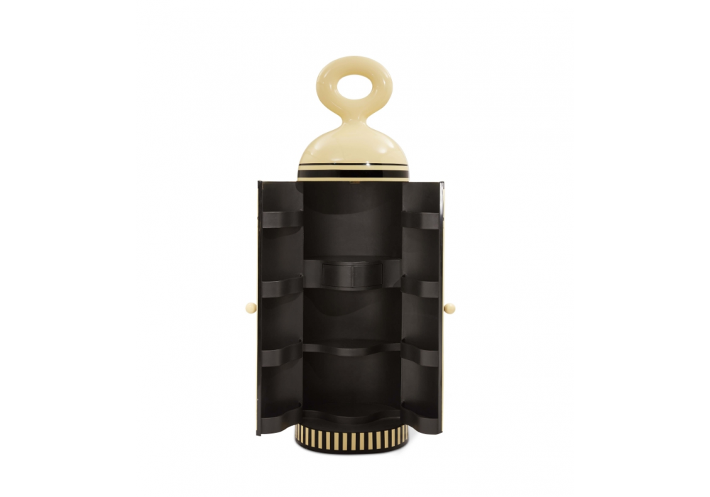 Madame Verdoux von Matteo Cibic für Scarlet Splendour entworfen, ist ein Bar-Möbel aus MDF, Sperrholz, Harzeinlage, Teakholz und Leder.