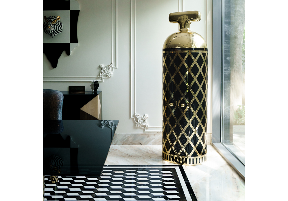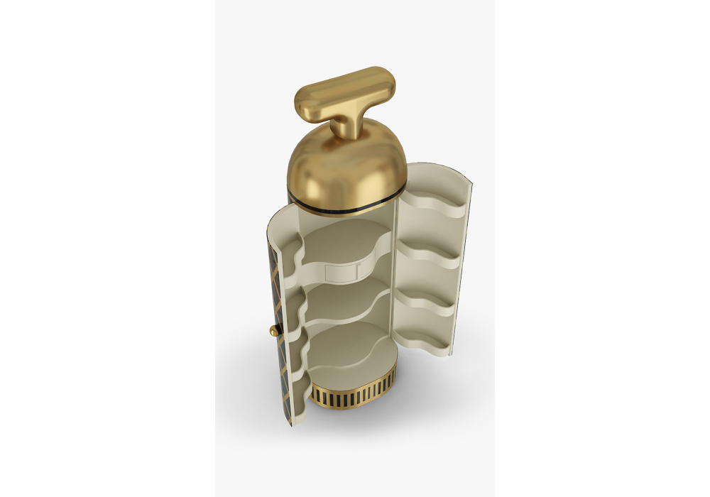 Monsieur Verdoux Black Gold, entworfen von Matteo Cibic für Scarlet Splendor, ist ein Bar-Möbel aus Sperrholz, Messing und Leder.