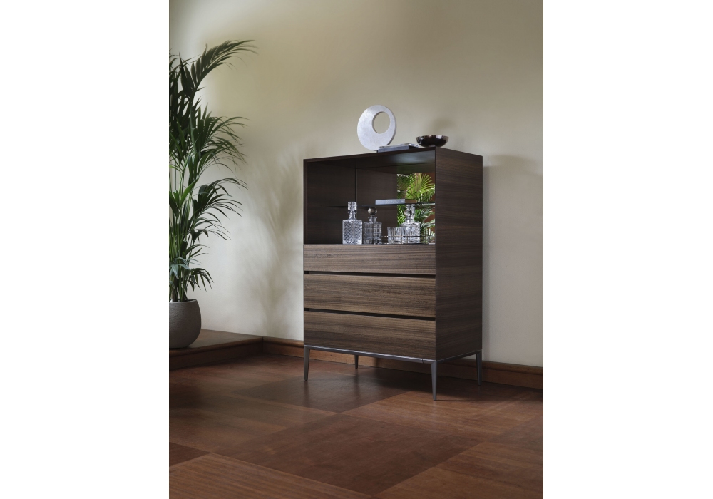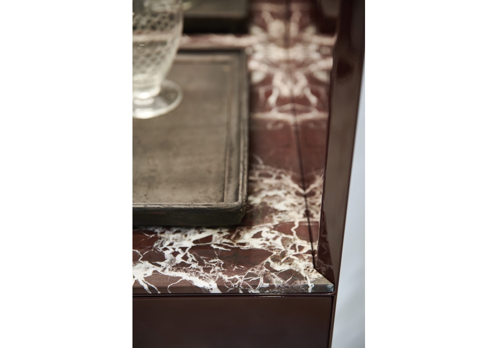 Avenue von Joe Garzone für Conte Casa entworfen, ist ein Bar-Möbel mit Holzoptik, matt oder metallisch lackierter Struktur und zur Struktur passenden Marmor- oder Holzplatten. Sockel aus bronzefarbenem oder schwarzem Metall.