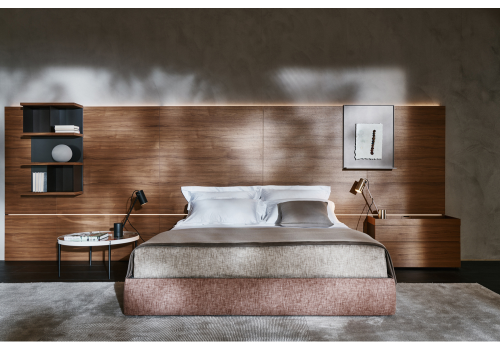 Ribbon von Vincent Van Duysen für Molteni&C entworfen, ist ein Bett mit Kopfteilstruktur aus Sperrholz mit Polsterung aus Polyurethanschaum unterschiedlicher Dichte. Polsterung in Stoff oder Leder mit Lederdetails, die entlang des gesamten Umfangs des Kopfteils und des Bettrahmens verlaufen.