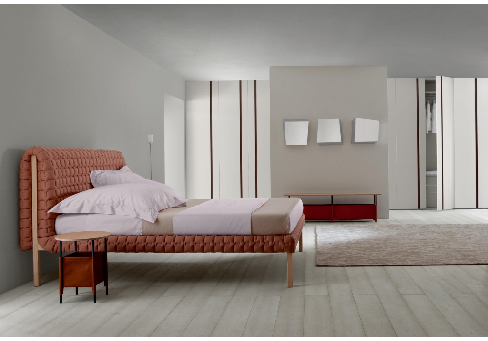 As with the Ruché settee, the Ruché bed, designed by Inga Sempé for Ligne Roset, is lifted from the ground by a simple, fine structure which supports a comfortable sleep platform. The headboard and frame are dressed with a distinctive quilting, a kind of boutis stitch of padding made using a cross-hatching of interrupted seams.