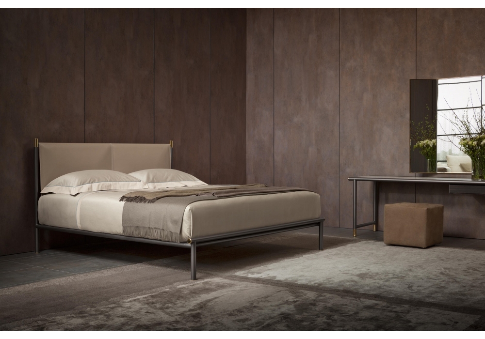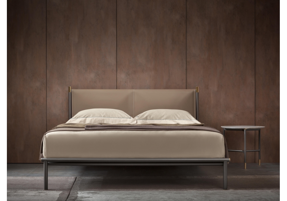 Iko von Rodolfo Dordoni für Flou entworfen, ist ein Bett aus Stahlrohr bestehende Bettstruktur aus brüniert matt erhältlich. Details aus Gold glänzend oder Nickel schwarz glänzend. Kopfteil aus Leder erhältlich in den Farben: Natur, Mokka, Schwarz, Bulgarisch Rot, Tabak, Sand, Schlamm, Haselnuss und Taubengrau.