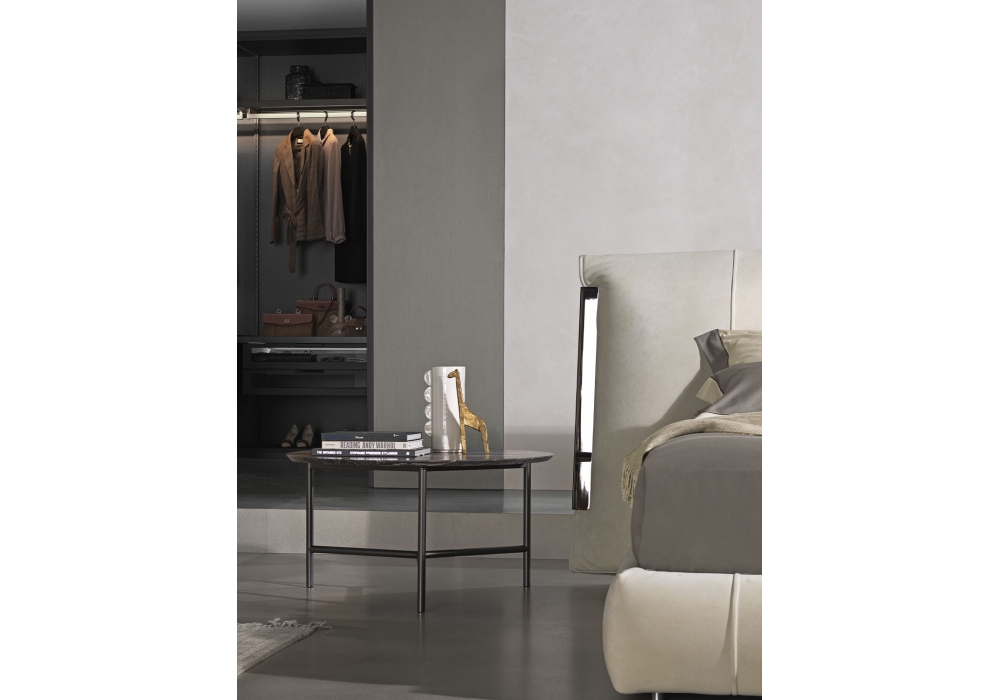 Amal von Carlo Colombo für Flou entworfen, ist ein stattliche Ehebett passt hervorragend zu einem erlesenen Kontext. Amal bekommt durch die Metallprofile eine besondere Note; sie "umklammern" den Bezug an den Kanten, was den weichen Gesamteindruck noch verstärkt. Die drei Metallprofil-Oberflächenfinishs (goldfarben glänzend, matt brüniert, nickel-schwarz glänzend) wurden so gewählt, dass die Kombination mit den diversen Bezugstypen erleichtert wird. Das gepolsterte Bettgestell ist in zwei Liegeflächenversionen zu haben: auseinanderbaubar und Liegefläche mit regulierbaren Federleisten oder mit Bettkasten. Gestell und Kopfteil sind vollständig abziehbar und der Bezug kann aus Stoff oder Leder angefertigt werden.