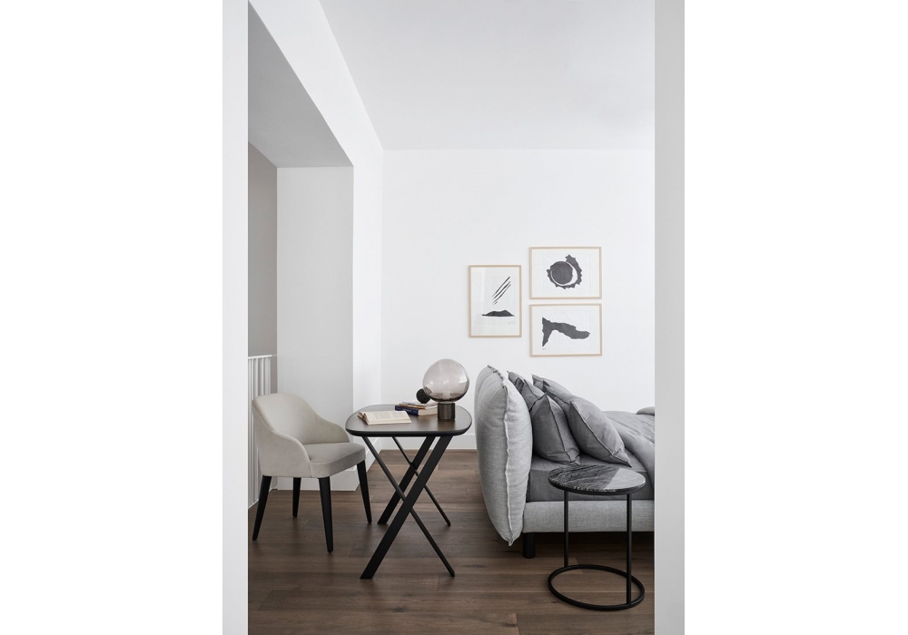Oliver von Andrea Parisio für Meridiani entworfen, ist ein Bett mit Holzstruktur und Mittelstange aus Metall, Holzfüße und abnehmbarem Bezug. Das Kopfteil besteht aus PU-Schäumen und Polyesterfaser.