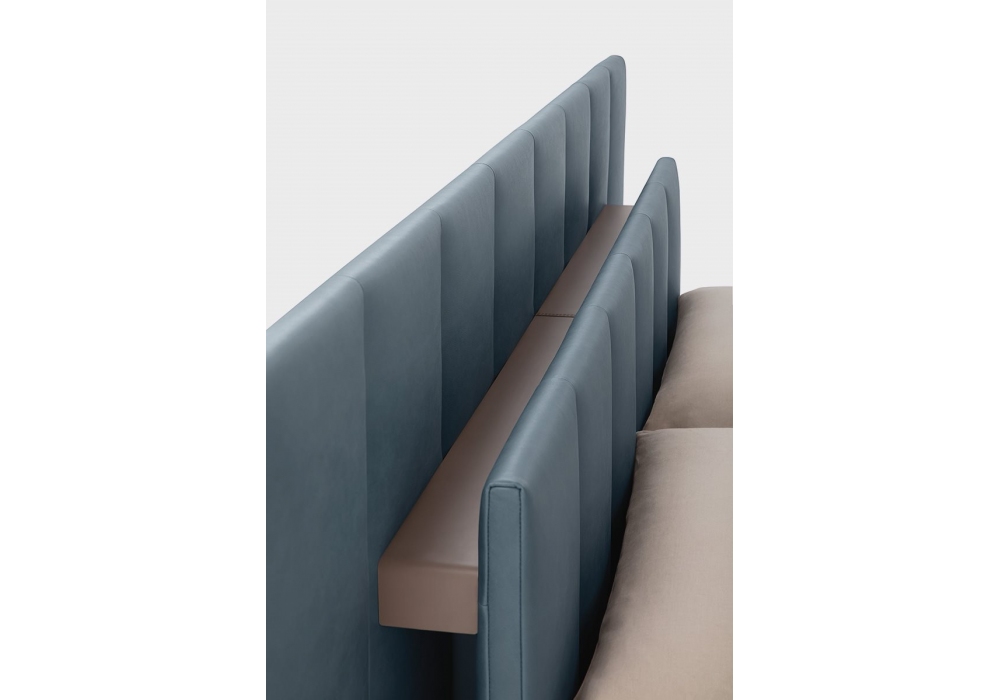 1879 Gala von Gabriele Rosa für Zanotta ist ein Bett mit einem hohen Kopfteil, das mit Bezügen aus Stoff oder Leder bezogen ist. Gebogenen Buchen-Dauben, naturfarben lackiert. Beine und Regale aus Stahl mit pigmentiertem Leder 90. In verschiedenen Größen erhältlich.