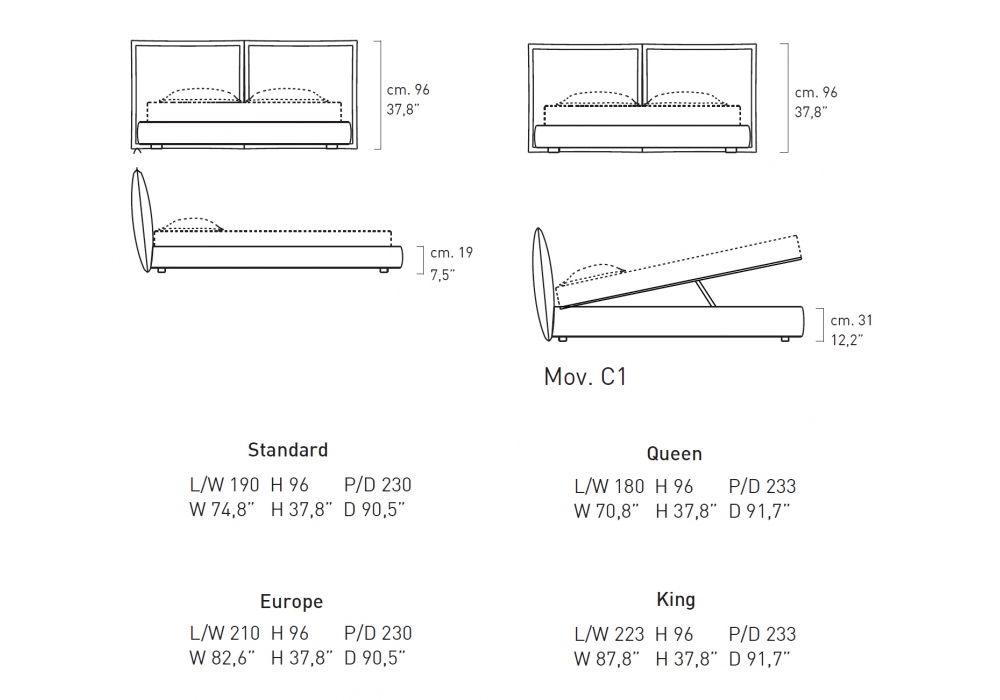 | Abmessungen | 190 x 230 x H 96 cm(Standard); 180 x 233 x H 96 cm(Queen); 210 x 230 x H 96 cm(Europe); 223 x 233 x H 96 cm(King). |