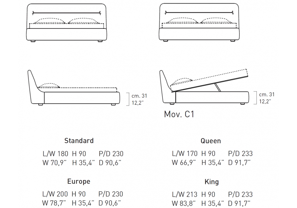 | Abmessungen | 180 x 230 x H 90 cm(Standard); 170 x 233 x H 90 cm(Queen); 200 x 230 x H 90 cm(Europe); 210 x 233 x H 90 cm(King). |