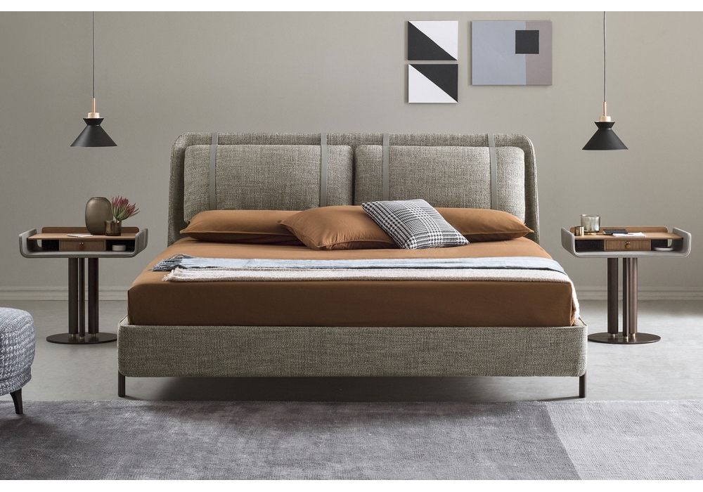 Nara von Umberto Asnago für Bodema entworfen, ist ein Bett mit einer Holzstruktur, die mit expandiertem Polyurethan überzogen ist. Metallgestell und Buchenlatten. Polsterung aus Polyurethan mit Futter aus Nylonfaser-Samt. Metallischer Stützfuß mit ovalem Querschnitt in Bronzefarbe und Einsatz aus wengefarbenem Buchenholz. Kopfteil mit Kissen oder mit Lederschnüren. Verfügbar in mehreren Ausführungen und Abmessungen.