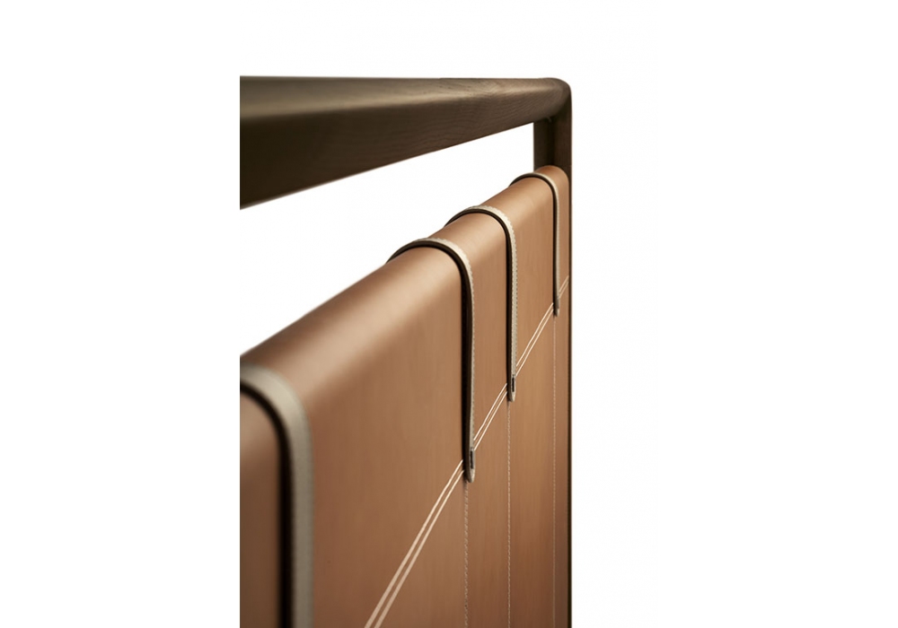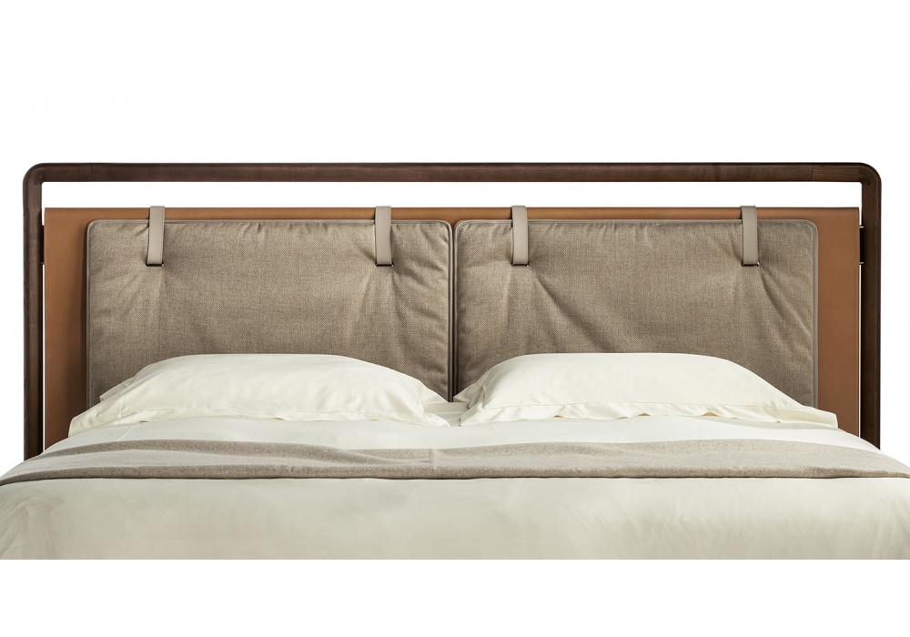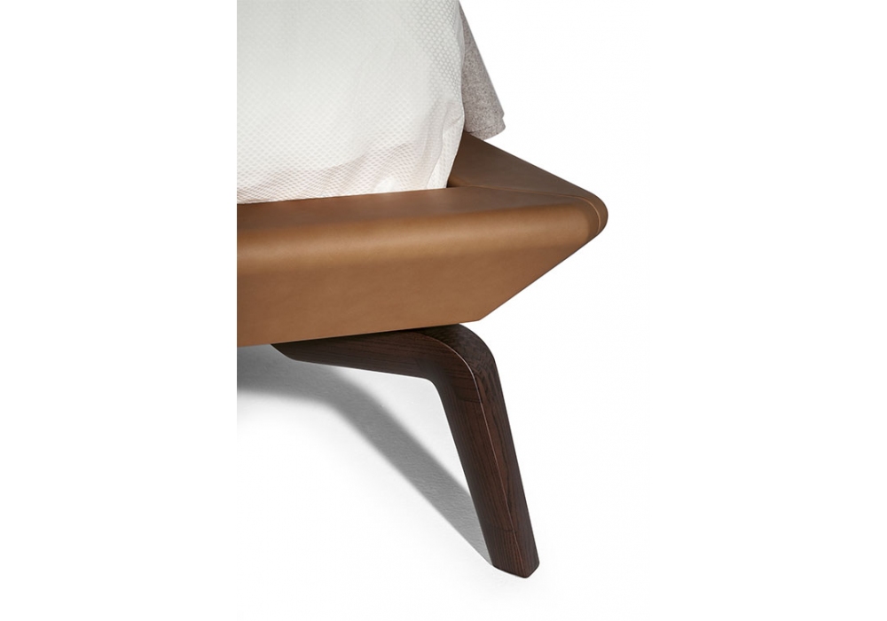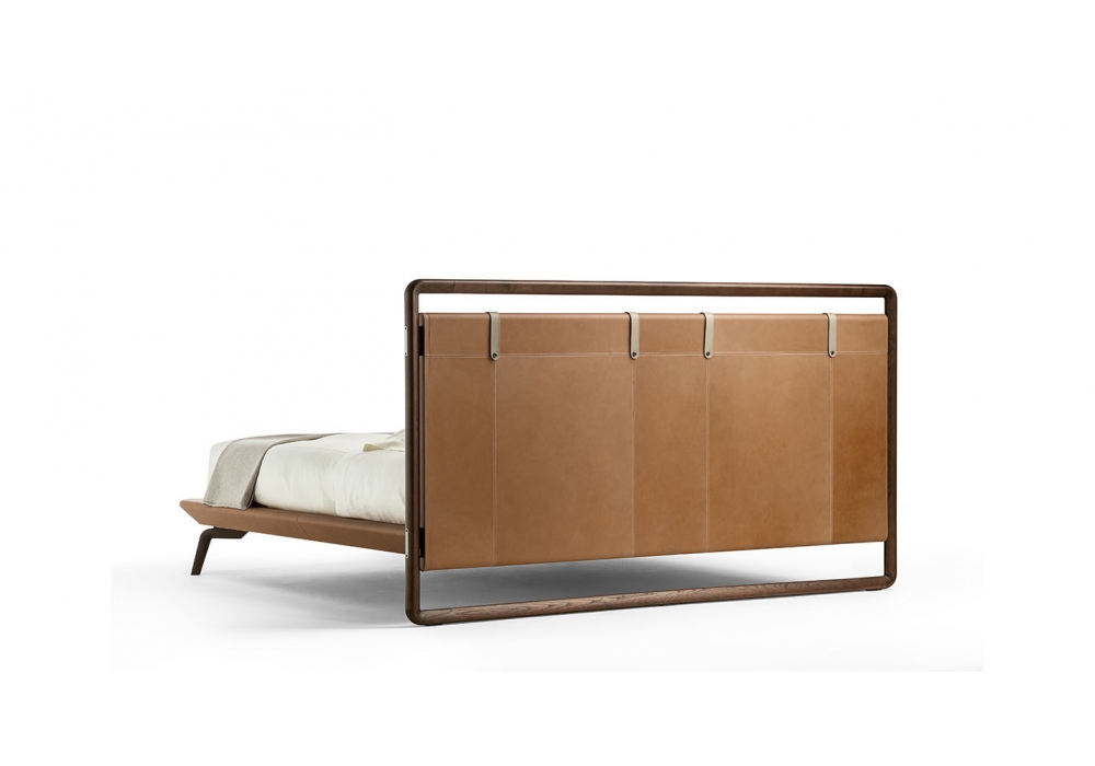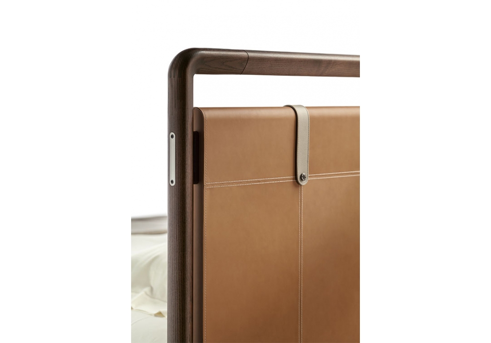 Volare Due von Roberto Lazzeroni für Poltrona Frau entworfen, ist ein Bett mit Kopfteil aus massiver Buche mit inneren Querstreben aus Birkensperrholz und Füllung aus Hartfaserplatten, gepolstert und mit Pelle Frau Leder oder Sattel bezogen. Kopfteilstruktur aus massivem Eschenholzrahmen mit speziellem Dreiecksprofil in Moka gebeizt. Bettrahmenbretter und Fußteil aus Tulpenholz und vollständig mit Leder oder Sattel bezogen.
