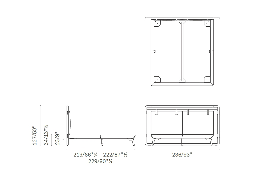 | Abmessungen | • 236 x 219 x H 127 cm (170 x 200 cm); • 236 x 219 x H 127 cm (180 x 200 cm); • 236 x 222 x H 127 cm (193 x 203 cm) |