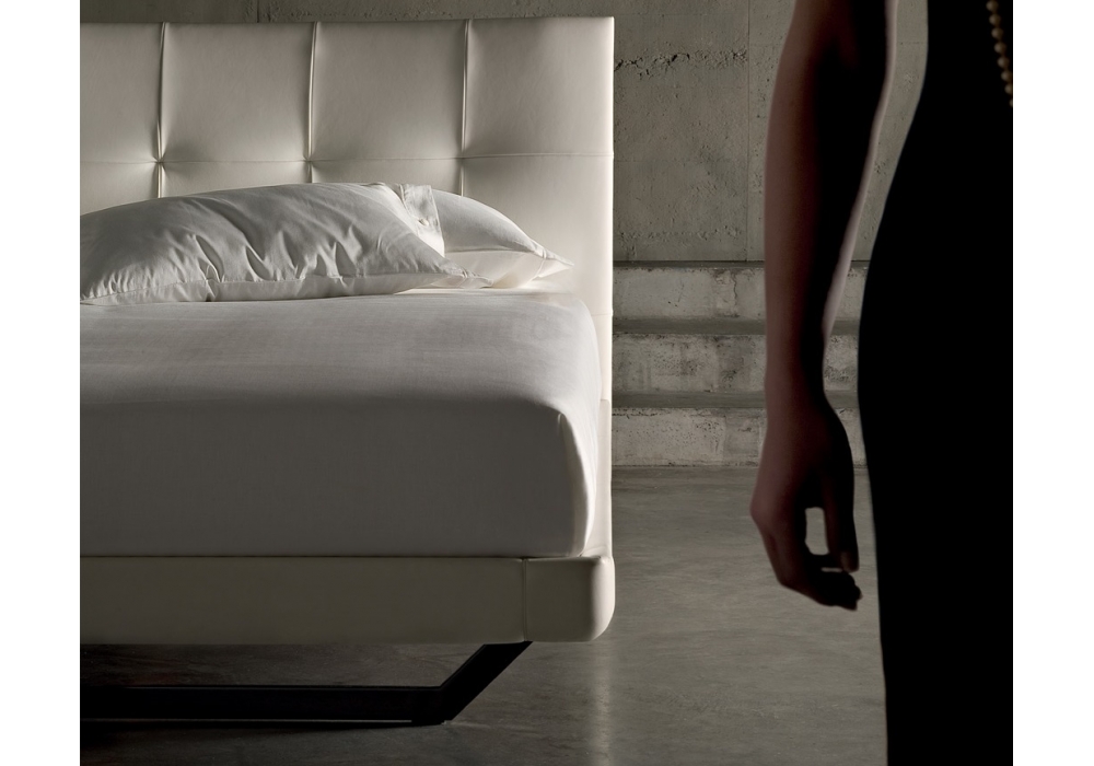 Bei Aurora Due ist es wie eine Umhüllung, mit einer Struktur aus Buchenholz. Die regelmäßige Steppverarbeitung des Bezugs aus Pelle Frau®-Leder erzeugt einen modernen Capitonné-Effekt. Das Bettgestell ist leicht mit Polyurethanschaum gepolstert, die Seitenteile sind aus Tischlerplatte aus Tannenholz und MDF, das Fußteil ist aus Pappelmultiplex. Die hinteren Füße stellen eine Verlängerung des Kopfendes bis zum Boden dar. Vorne besteht das Untergestell aus Holz mit kratzfester schwarzer Lackierung aus einem einzigen trapezförmigen Brett, das die gesamte Bettbreite einnimmt. Das Untergestell ist auch als trapezförmiger Metallrahmen in drei Ausführungen erhältlich: schwarz lackiert, nickelbruniert oder verchromt. Das Bett Aurora Due ist mit dem Rest der Sammlung Pläne integriert Poltrona Frau Notte ®.