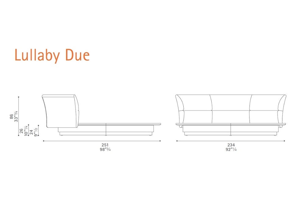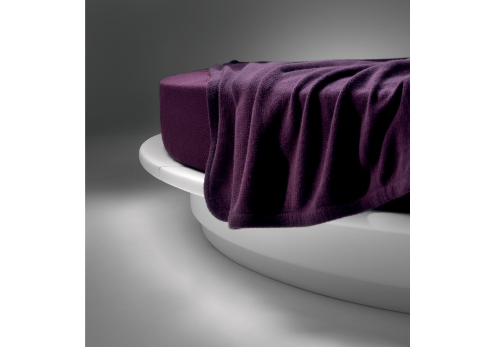 Lullaby Due Bett Poltrona Frau: Das Kopfteil zeichnet sich durch sein Flügelprofil und sichtbare Nähte aus. Es besitzt einen Stahlrahmen, eine formgepresste PUR-Schaumstoff-Polsterung. Das Kopfteil ist auf einen drehbaren Sockel montiert, der sich dank eines Drehmechanismus in seinem Innern um 360° im Uhrzeigersinn und gegen den Uhrzeigersinn bewegen lässt. Der Sockel besteht aus schichtverleimtem Pappelholz und ist mit PUR-Schaumstoff gepolstert. Die Liegefläche aus Schichtholz, auf denen die Matratze aufliegt, ist mit PUR-Schaumstoff gepolstert und mit Poltrona Frau-Stoff bezogen. Um das Handling und den Transport zu erleichtern, werden Bett und Matratze in zwei Halbkreise geteilt geliefert. Die gelieferte Matratze (Durchmesser 220 cm x 20 cm Höhe) besitzt Taschenfedern aus Stahl und ist auf der Winterseite mit Wolle, auf der Sommerseite mit Baumwolle gepolstert.