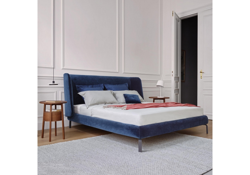 Desdemone von N. Nasrallah & C. Horner von Ligne Roset entworfen, ist ein Bett mit Struktur aus Rohren und Paneelen aus mehrschichtigen Verkleidungen mit Polyurethanschaum und Polyester-Steppung. Kopfteil (hoch oder niedrig) aus Rohren und Metallgewebe mit Polyurethanschaum und Polyestersteppung. Jede Art von Lattenrost kann verwendet werden. Bezug aus Stoff. Verfügbar in verschiedenen Abmessungen.