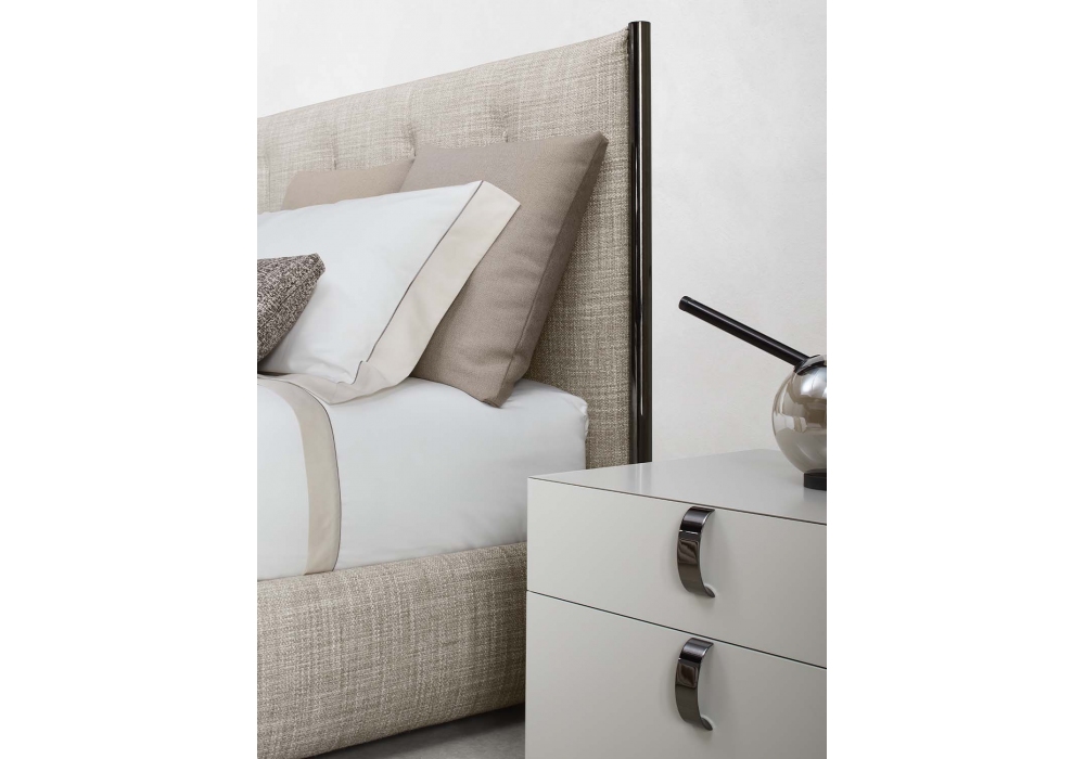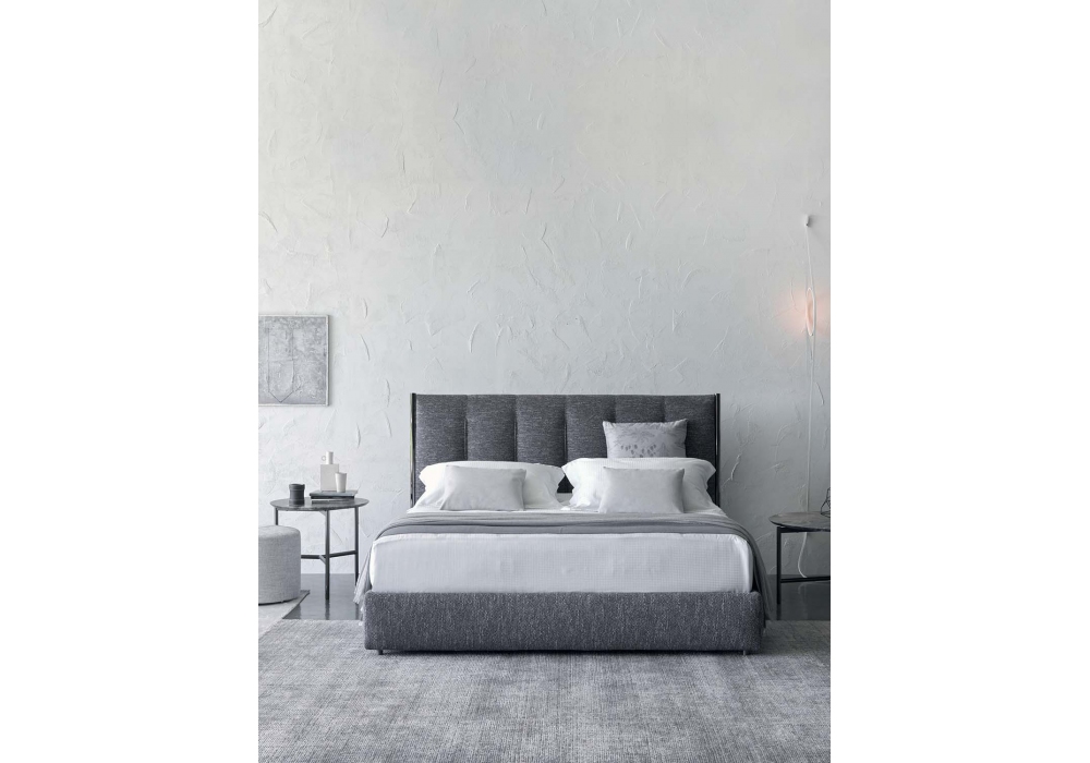 Koy von Carlo Colombo für Flou entworfen, ist ein Bett mit gepolstertem Untergestell und Kopfteil mit Stoff- oder Lederbezug. Metallstruktur die bis zum Boden reicht und die Bettfüße bilde. Metallfüße in glänzend schwarzem Nickel oder matt brüniert. Gestell mit festen Federleisten, Bettkasten, elektrisch verstellbarem Gestell oder mit dem Gestell "Leonardo“.